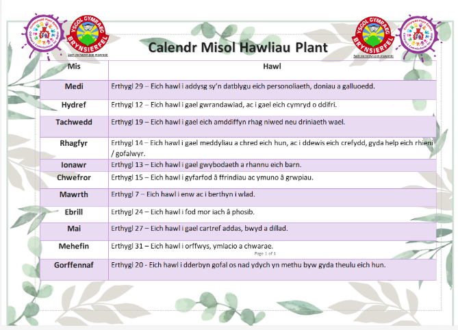 Fel rhan o raglen hawliau Comisiynydd Plant Cymru, mae ein hysgol yn cymryd camau gweithredol i ymgorffori egwyddorion hawliau plant ar draws pob agwedd o fywyd ysgol. Mae'r bartneriaeth hon yn cefnogi ein disgyblion i ddod yn unigolion gwybodus, hyderus a grymus sy'n gwybod eu hawliau ac yn deall sut i eiriol drostynt. Fel rhan o'r bartneriaeth hon, mae gennym 'Hawl y Mis' bob mis ynghyd â 'Mater y Mis'. Trafodir y rhain yn fanwl ym mhob ystafell ddosbarth a gwasanaethau.